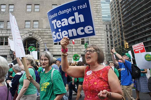 “我們走向全球毀滅的時間已經非常近了,但我們還有一些機會防止地球一年暖化兩度以上” Sally Long 在紐約多所學校擔任財務主管。她拿著標語” Climate change is real, TEACH SCIENCE.(氣候變遷是真的在發生了! 教導你的孩子科學)”