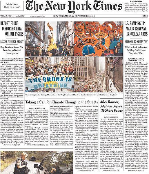在這個週末(2014.9.21)裡,世界上有160個國家都舉辦了這場氣候變遷遊行,包含了英國、阿富汗到澳洲等國,其中紐約市是最大的遊行,估計吸引了將近310,000人參加。